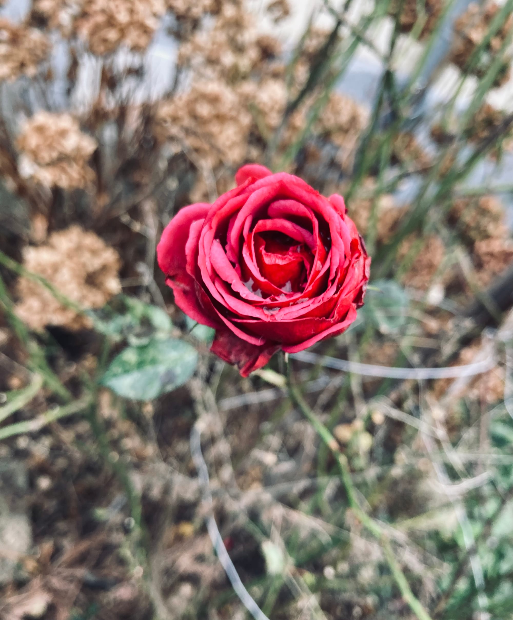...die leuchtend rote Rose mitten im Dezember, mitten im verwelkten Braun eines Vorgartens meiner Nachbarschaft. Als wollte sie sagen: Halt' durch. Shine on. Es mag kalt und unwirtlich sein, das heißt aber nicht, dass du eingehen musst. Schau mich an, ich bin ein strahlender Knaller mit dem auch keiner rechnet.