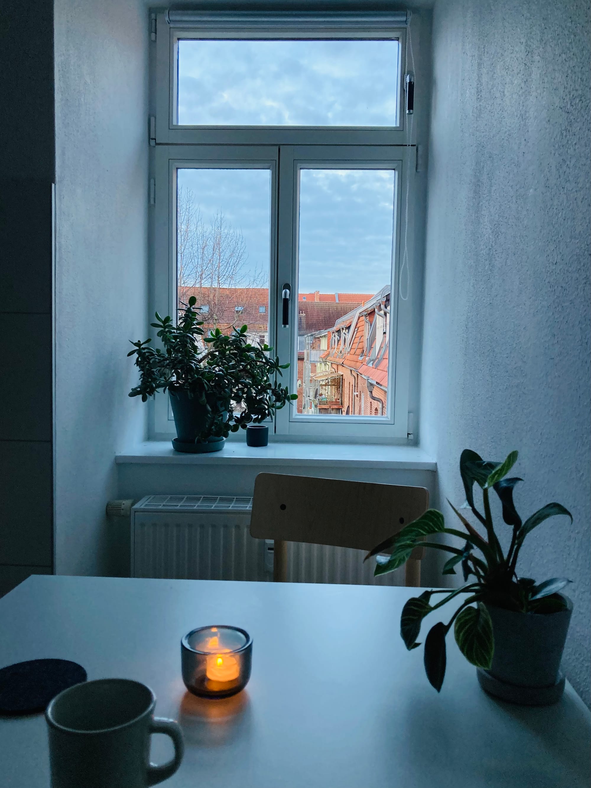 Liebster Platz zum Rumsitzen und Rausgucken, mit oder ohne Kaffee, zum Mittag- oder Abendessen, allein oder nicht, zum Beobachten der Tauben, Krähen und Spatzen. Die glänzen heute mit Abwesenheit, kamerascheues Volk. Wir sehen uns morgen, birdies.