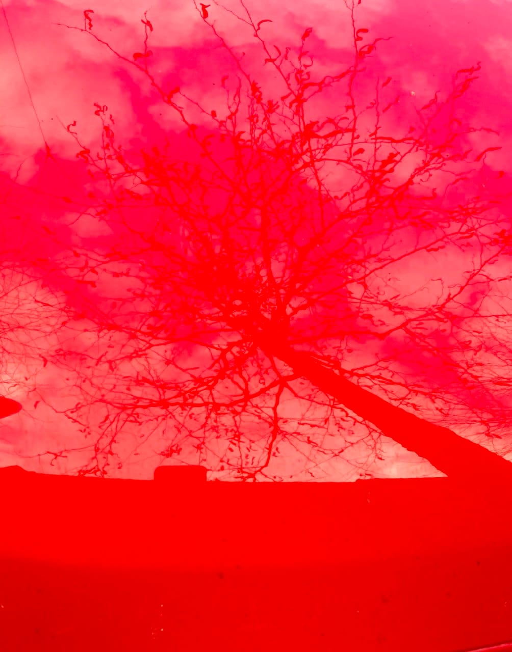 Rot entgeht mir, nicht meine Farbe, verliere ich heute ewig aus dem Blick. Und doch: Ein rotes Auto, auch nur schön, wenn es als Spiegel für Bäume dienen darf.