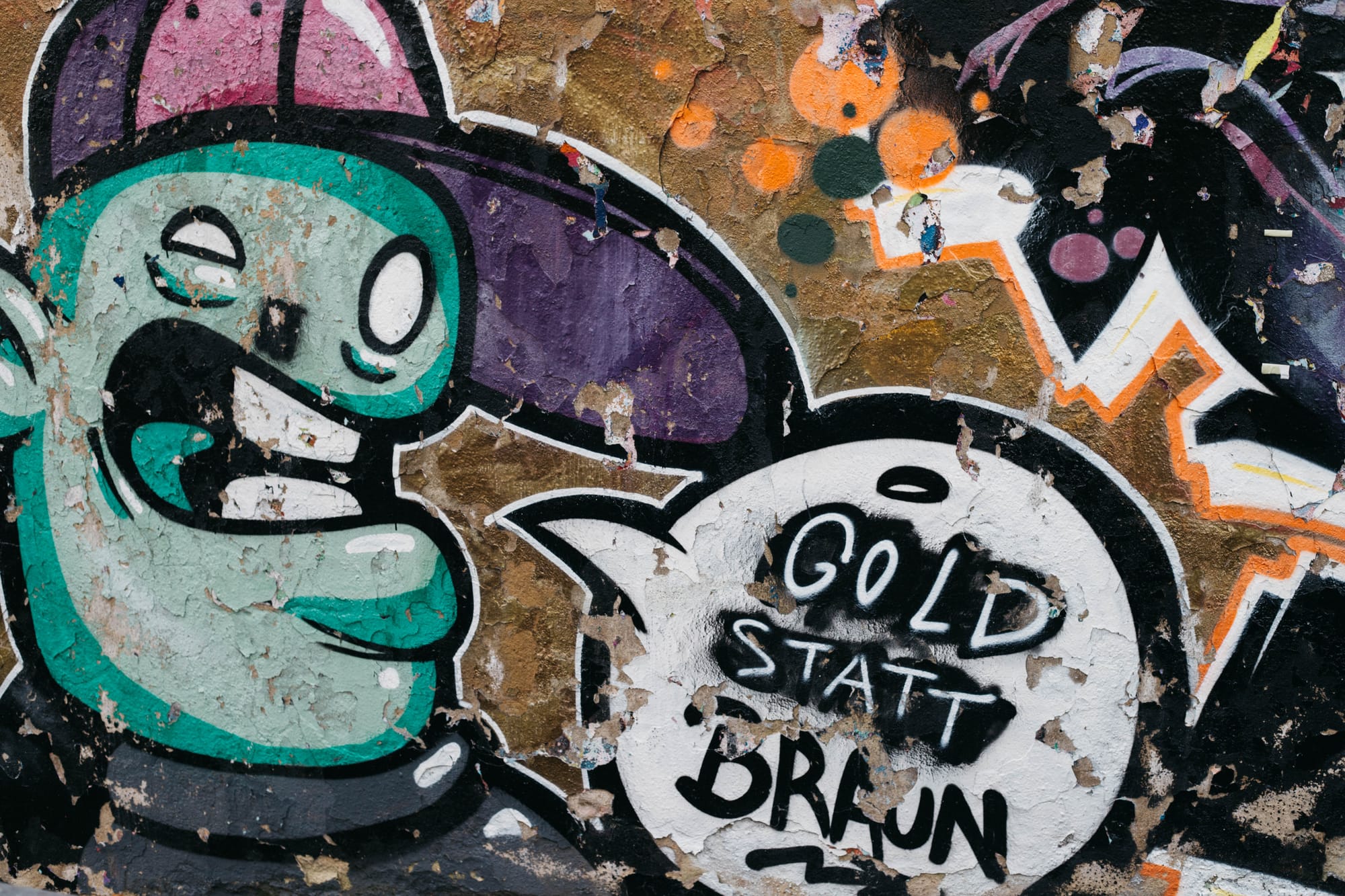 Hier als bunter Widerstand, gegen das Grau und Braun im öffentlichen Raum. Mal mehr, mal weniger ästhetisch und aussagekräftig, dafür immer richtig aufmerksamkeitsmagnetisch. Lohnt sich immer, so ein Farbsuchspaziergang.