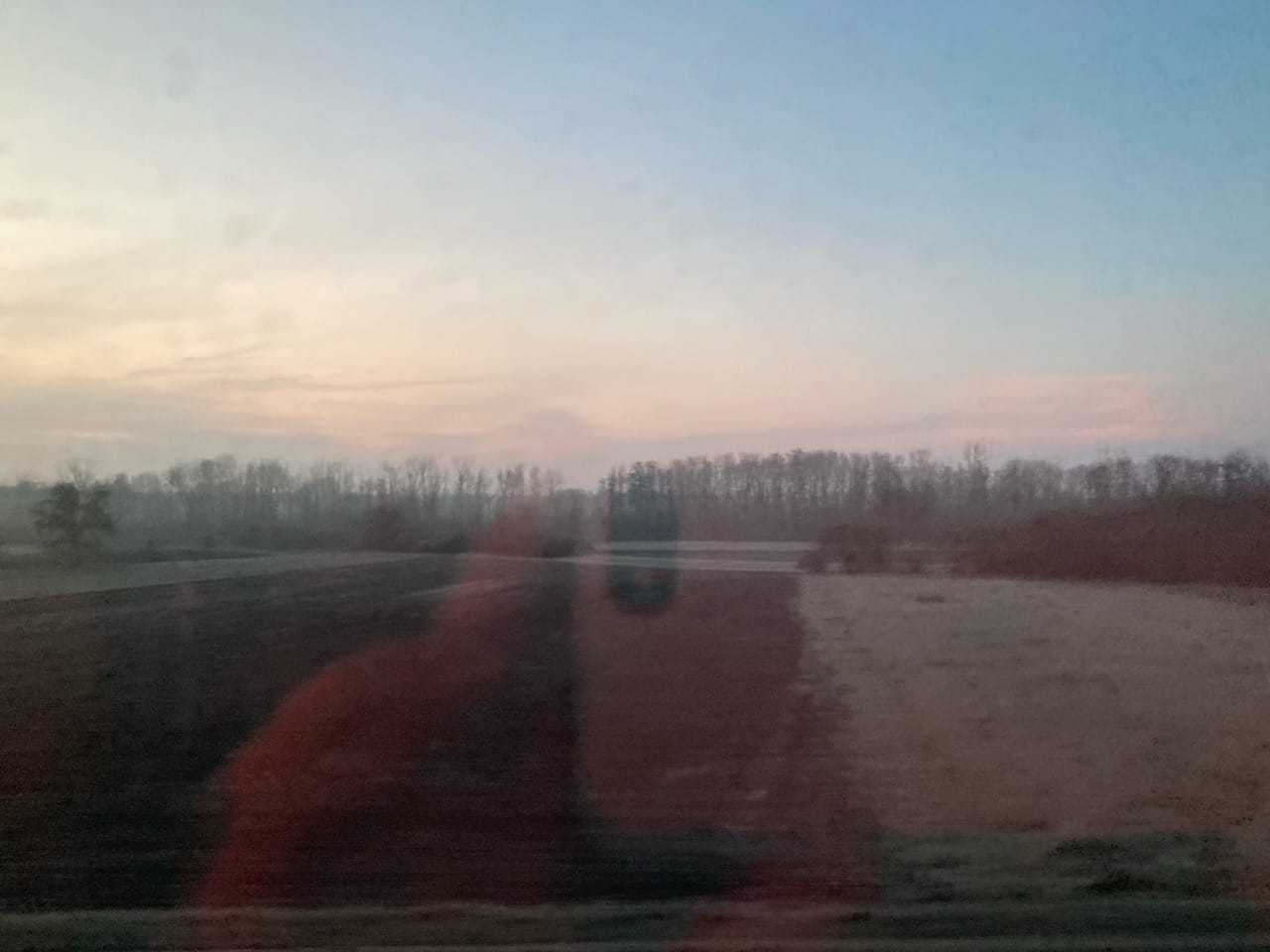 Kahle Bäume. Braune Felder. Dazwischen Feldwege. Noch leere Straßen. Wolkenschlieren. Krähen. Ein paar Gartenhäuschen. Wieder Felder. Vier Rehe. Eine Reihe Büsche, eingefrostet. Strommasten. Häuser, manche neu gebaut, einige verfallen. Industriegebäude. Graffiti an einer Lagerhalle. Ampel. Mehr Strommasten. Hinweisschilder. Ein Schwarm Tauben. Rosa Sonnenaufgang. Waldstück. Zäune. Gerümpel im Garten. Ein Greifvogel auf seinem Ast. Wiesen. Flüsschen. Weiden am Ufer. Darüber Blauer Himmel. Flugzeug mit Kondenstreifen.